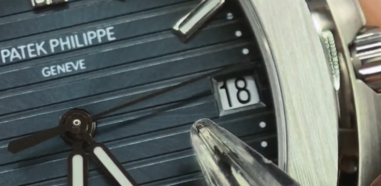 次に、グリッドパターン自体も進化しました。旧バージョンではグリッドがやや広く、日付窓の底辺がグリッドの底辺と平行でしたが、新バージョンではグリッドが少し狭くなり、日付窓の底辺がグリッドを超えてわずかに延びています。画像のズームショットがその違いを物語っています。これらの変更は欠陥ではなく、本物のパテックフィリップウォッチにも見られるバージョン差を反映したものです。BBF工場のノーチラス N級品らしいリアリティで、コレクターの心を掴んでいます。ケースはステンレススチールで、八角形ベゼルと統合型ブレスレットがスポーティーな印象を与え、全体のバランスが抜群です。