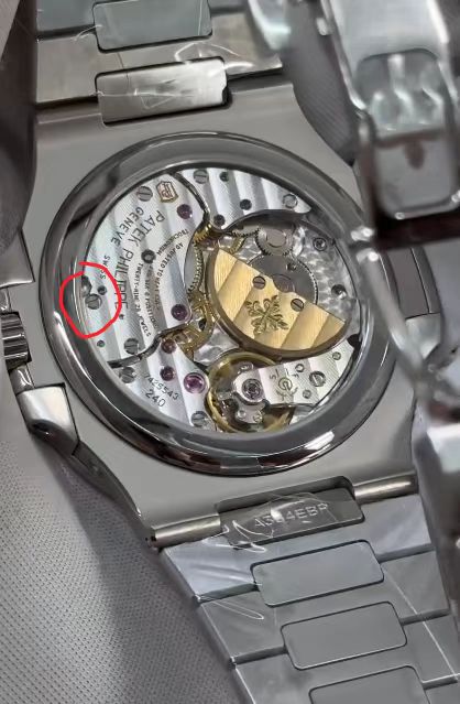 OMEのフラッグシップモデル、ノーチラス 5712のV2版は、主にムーブメントの改良がポイントです。V1からの変更点として、赤丸で示された2箇所が挙げられます: