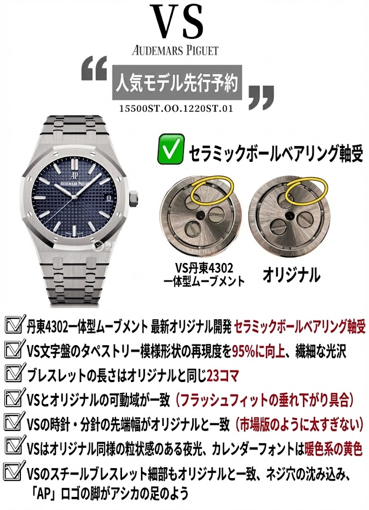 ムーブメント面では、VS工場が独自開発したDD4302クローンを搭載しています。これは安定性が高く、日常使いに最適です。一方、APSのSH4302ムーブメントは長年のテストで信頼を築き、近日中に本物のフリースプリングバランス搭載版を発表予定です。短期的に見て、APSの15500が多くの顧客の第一選択になるでしょうが、VSのDD4302ムーブメントも精度と耐久性で負けていません。オーデマピゲ スーパーコピーを探すなら、こうしたムーブメントの違いを考慮して選ぶのが賢明です。