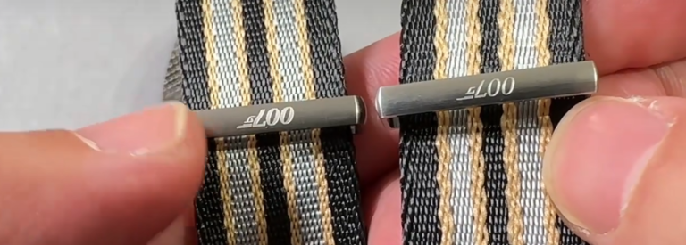 また、両モデルともNATOストラップが付属しますが、バックルの「007」刻印には違いがあります。VS工場の刻印の方が太くはっきりとしており、力強い印象を与えます。