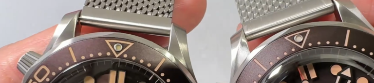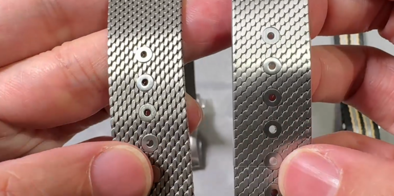 このモデルの最大の特徴は、軽量なチタン製メッシュブレスレットです。両工場ともにチタン素材を使用していますが、その仕上がりには明確な差があります。