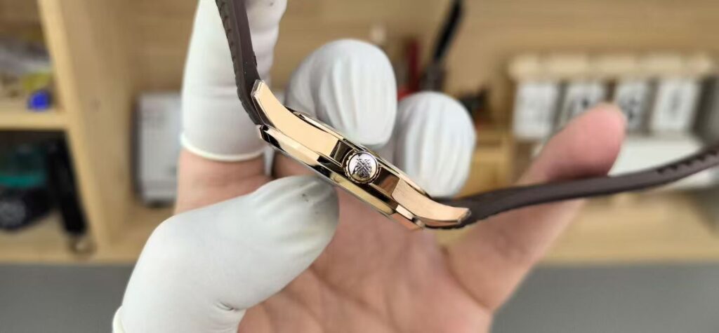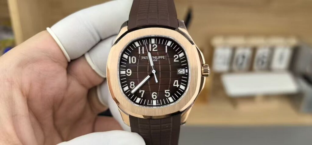 RC工場製のローズゴールドでも見られた問題ですが、アクアノートでも同様に文字盤の色味に違和感があります。純正の深みのあるチョコレートカラーとは明らかに異なり、詳しい人が見ればすぐに偽物と分かってしまうレベルです。