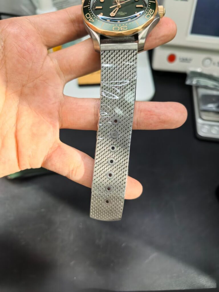 OR工場のシーマスター レプリカには、チタン製のメッシュブレスレットが標準装備されているだけでなく、Dバックル付きのグリーンラバーストラップも提供されています。