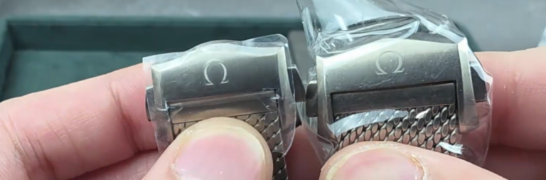 - クラスプのロゴ: 本物の時計は、クラスプに刻印されているオメガのロゴが一回り大きくデザインされています。