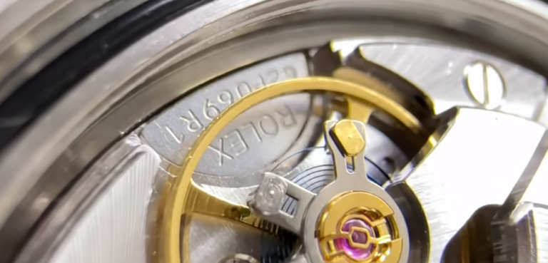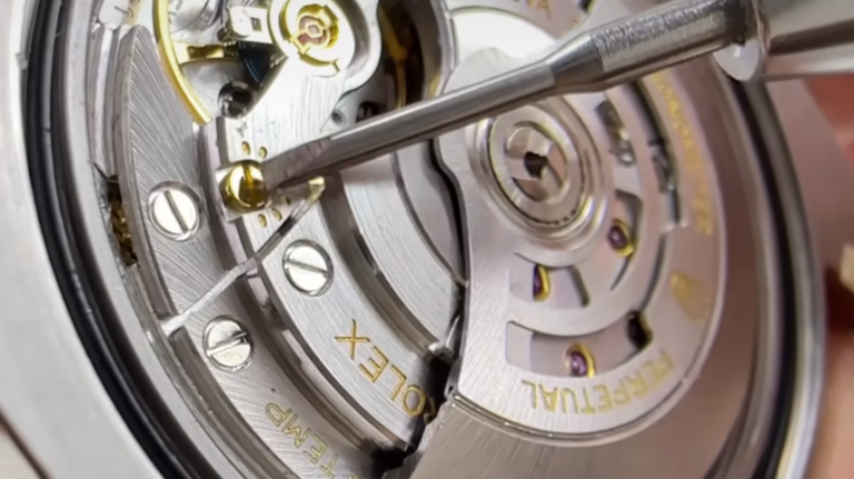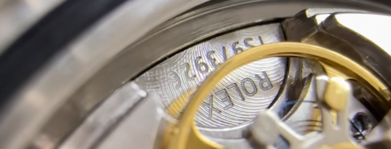 テンワの下に隠れている、半円形のプレート部分にも注目してください。ここには「ROLEX」の文字とシリアルナンバーが刻印されています。